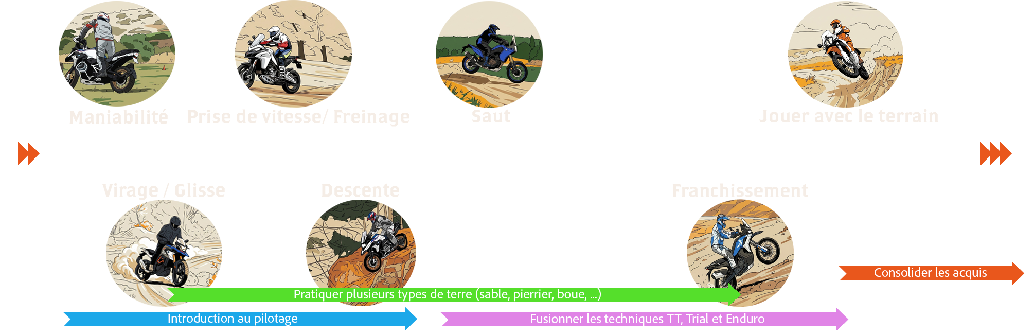 L’offre 2 journées stage complète s’adresse aux confirmés, débutants et initiés souhaitant apprendre ou approfondir l’ensemble des techniques de base de la conduite en moto tout-terrain. Ces deux journées complètes permettent de perfectionner les techniques avec des exercices plus poussés et de développer une vraie maîtrise du deux-roues en conditions offroad. Le programme élaboré par nos instructeurs qualifiés combine théorie et pratique intensive.
